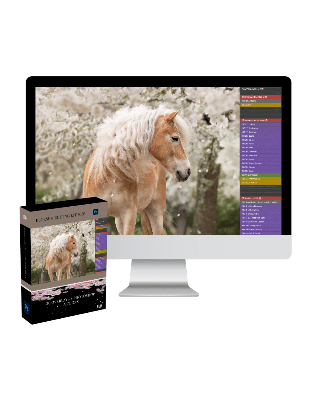 30 overlays + Photoshop Actions. Klik, kies een toon, klaar. Geen gokken meer.