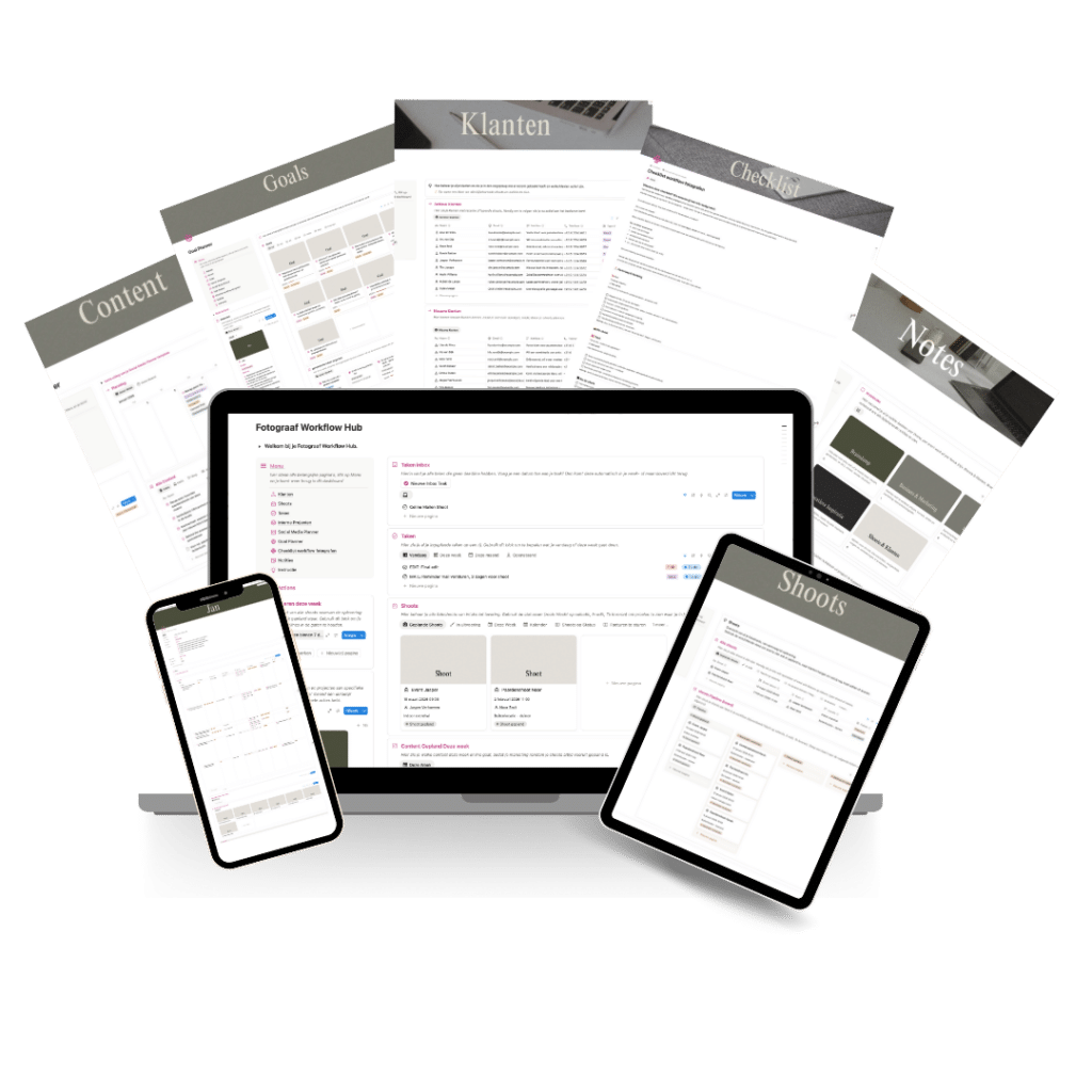 Daarom heb ik de Fotograaf Workflow Hub gemaakt: een Notion template waarin je klanten, shoots en je planning logisch samenkomen. Het is geen extra tool “erbij”, het is juist de plek waar je rust terugpakt.