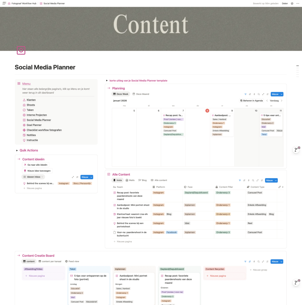 De meeste stress komt niet van content maken, maar van alles bij elkaar moeten houden. Ideeën in je telefoon, klanten in DM, planning in je agenda, en dan nog ergens een lijstje met “posts die ik nog moet maken”.