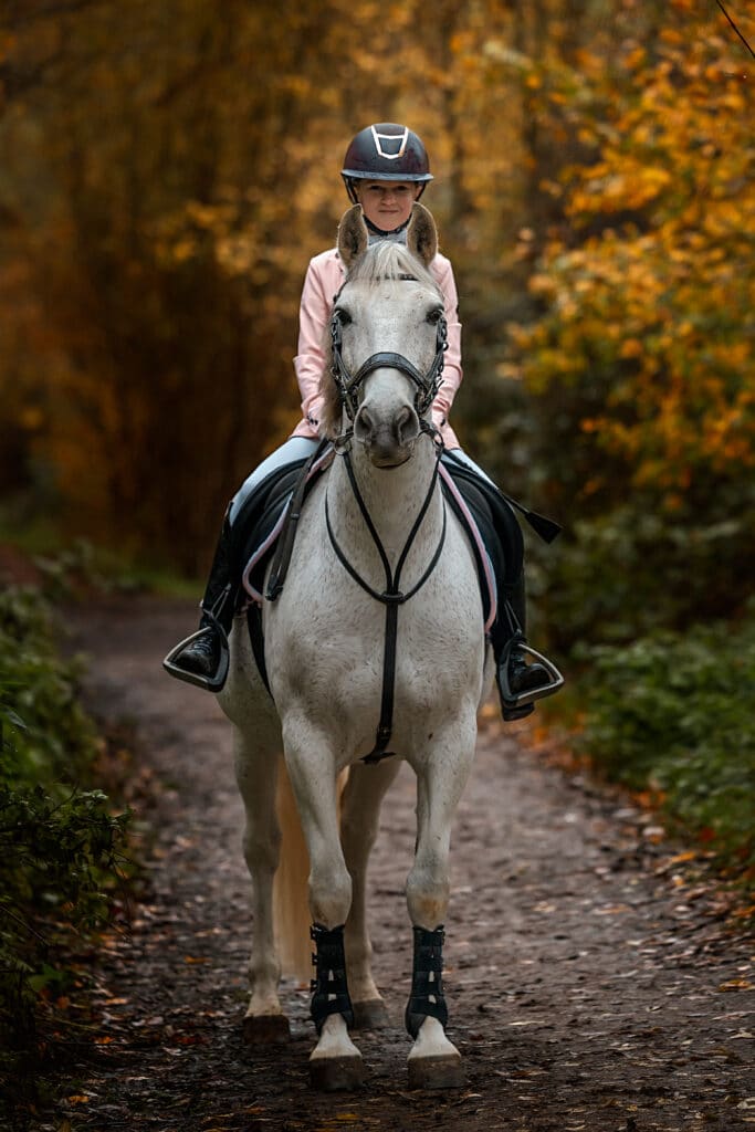 FOTO 1 — Herfstportret (wit paard op bospad)