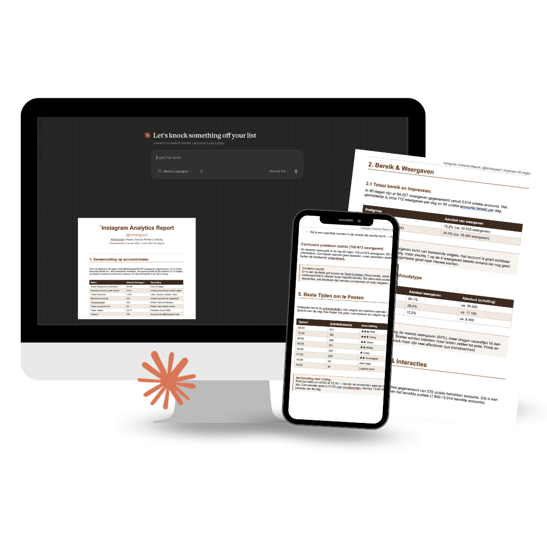 Je laat Claude AI door je Instagram Insights lopen. Claude vertelt je precies wat werkt, wat niet en hoe je je content aanpast zodat het wel leidt tot boekingen.