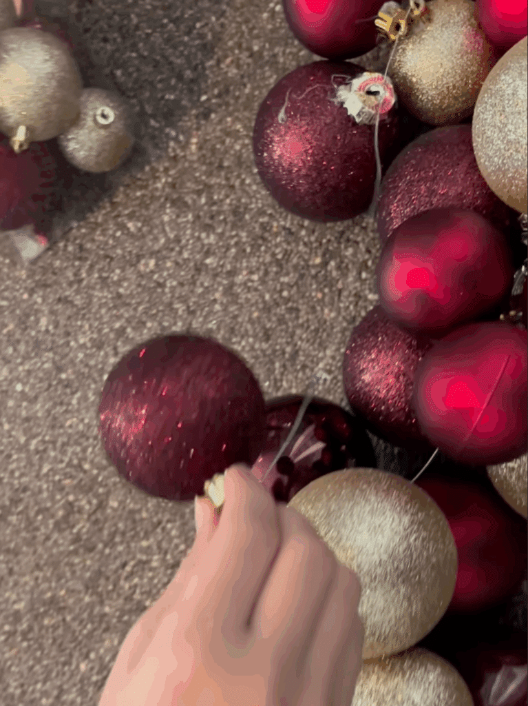 Als alle ballen geregen zijn is het tijd om de krans af te maken, breng de twee uiteinden van het flexibele ijzerdraad bij elkaar zodat de krans een mooie ronde vorm krijgt.