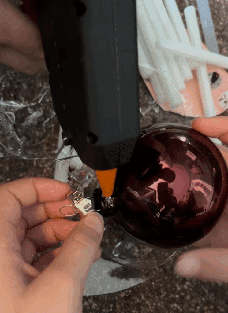 Pak vervolgens elke kerstbal en doe een klein beetje lijm rondom het kroontje waar het vastzit aan de bal, je hoeft niet veel te gebruiken maar zorg dat het helemaal rondom zit zodat het kroontje niet meer los kan.