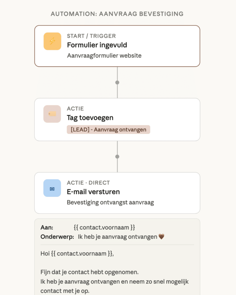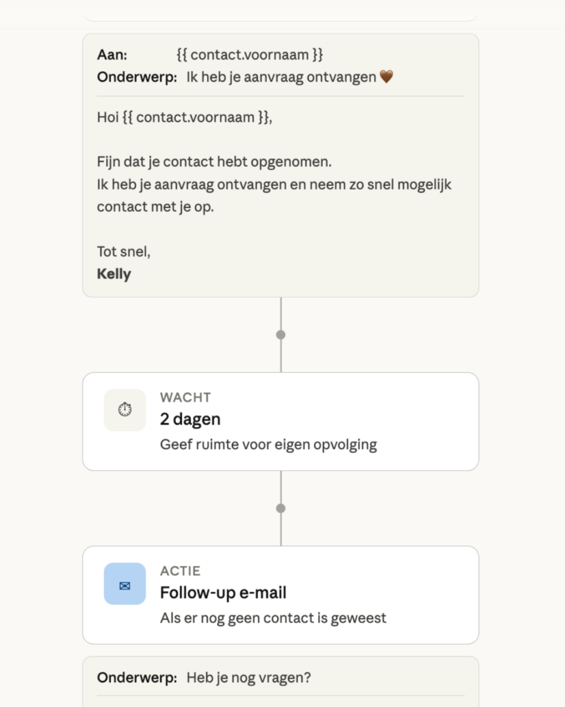 Dit moment is belangrijker dan het lijkt. De klant heeft net betaald en wil weten: wat nu? Een automatische mail met de bevestiging, de datum en wat ze kunnen verwachten geeft vertrouwen. Het is het startpunt van de samenwerking.