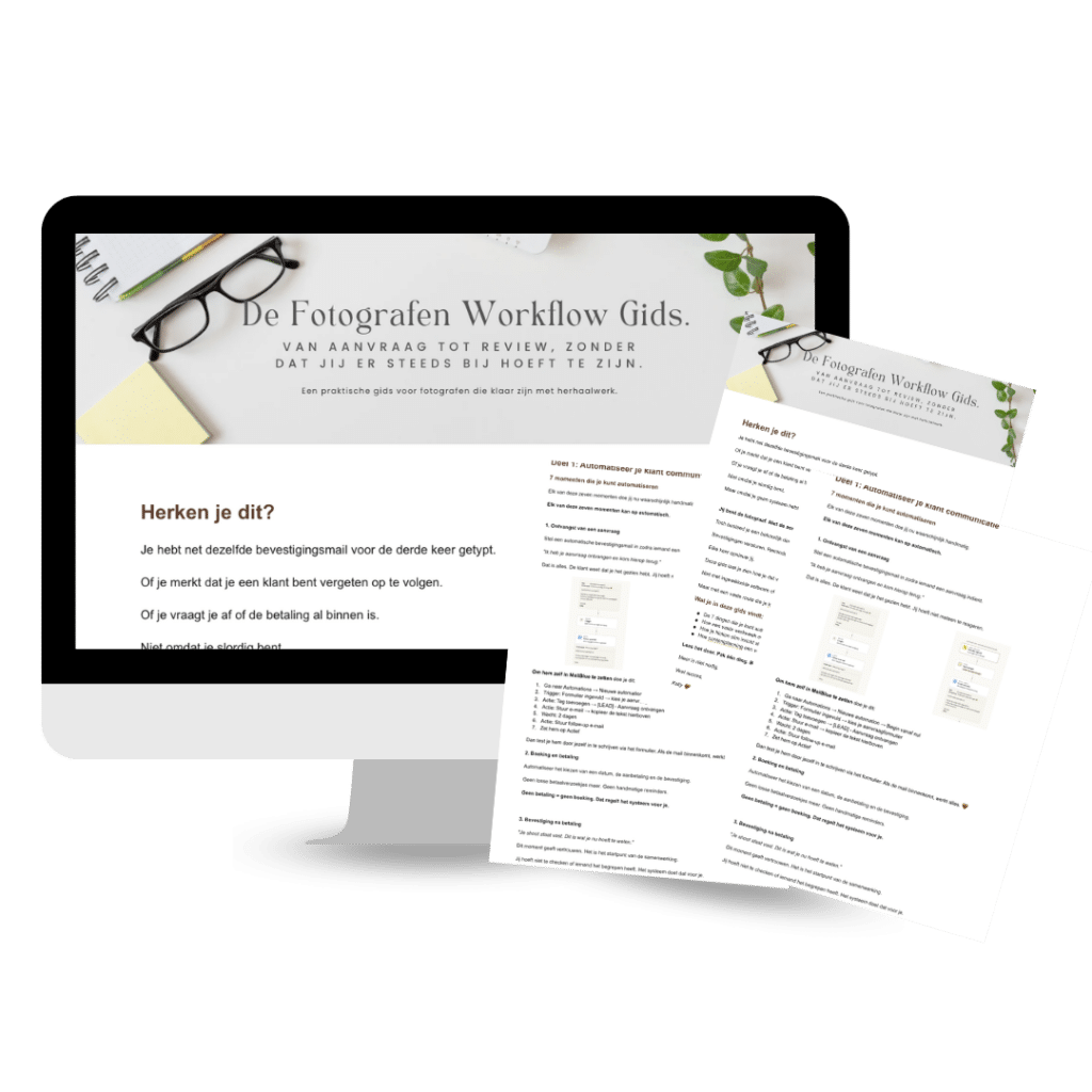 Download de gratis Fotografen Workflow Gids. Daarin vind je de zeven automatiseringsstappen uitgewerkt, een vaste werkweekstructuur en praktische tips voor Notion en contentplanning.