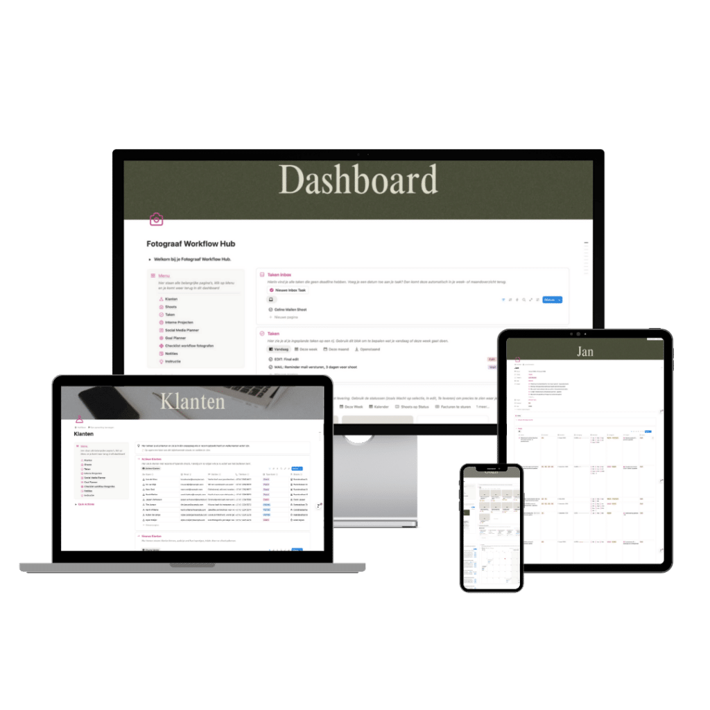 In de Fotograaf Workflow Hub zet je klanten, shoots en planning logisch bij elkaar, zodat je niet alles bij elkaar hoeft te zoeken