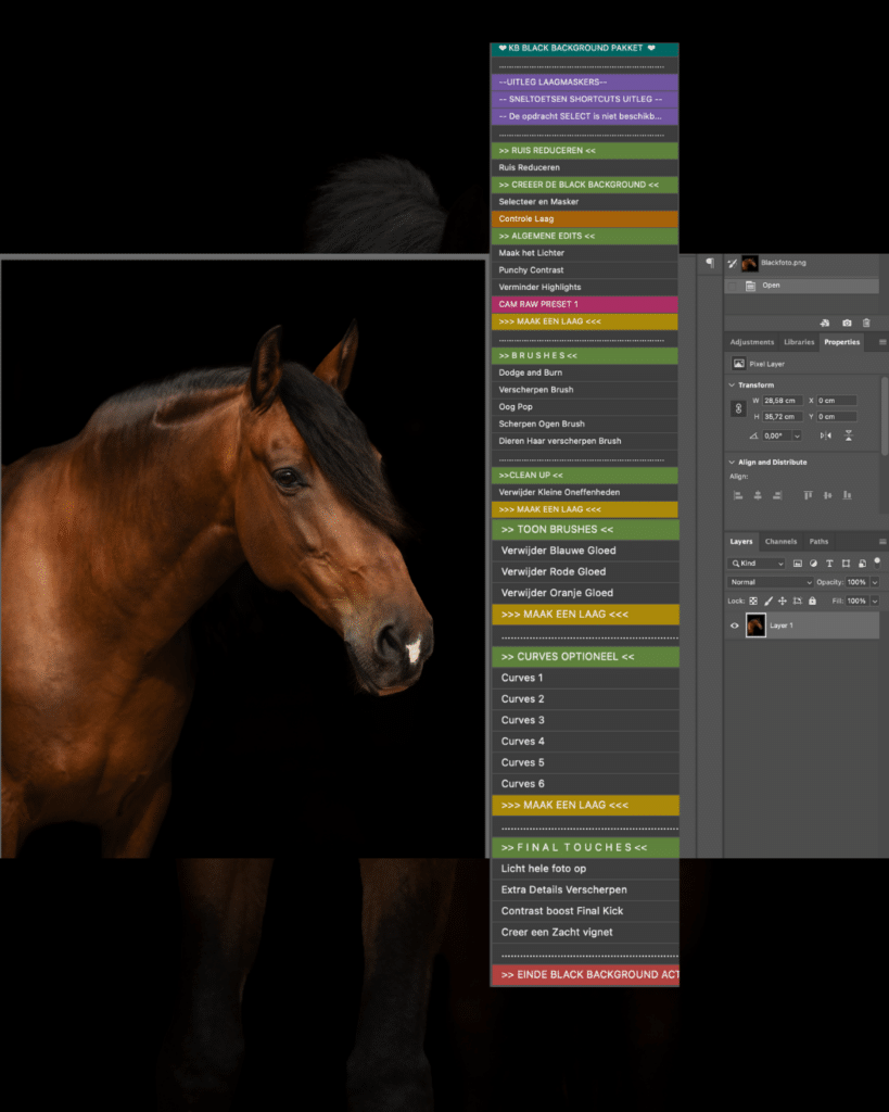 Het geeft je de acties die ik zelf gebruik voor de meest voorkomende Photoshop-stappen in paardenfotografie. Geen puzzelen, geen raden. Gewoon een vaste volgorde die werkt.