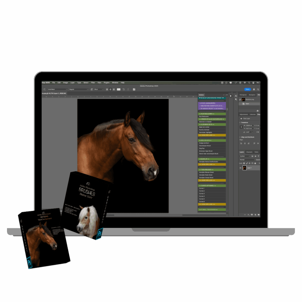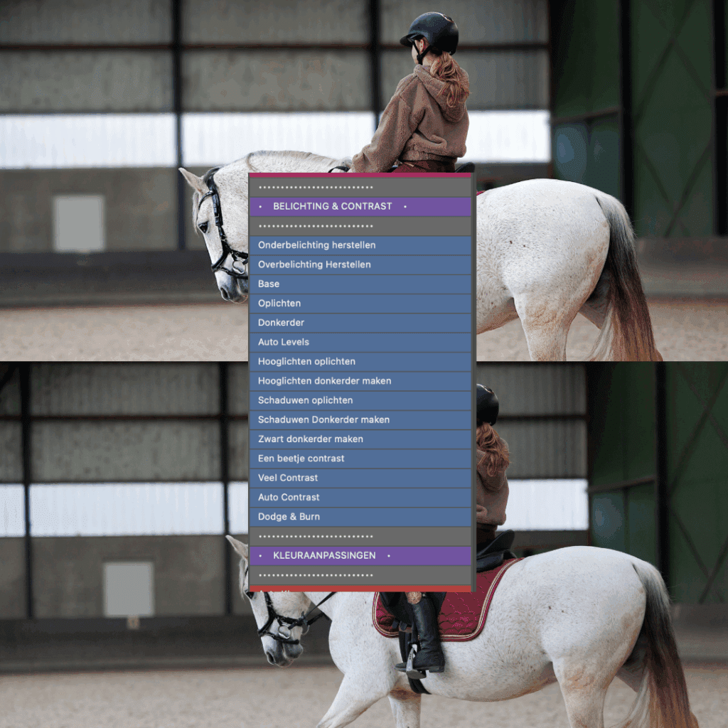 Belangrijk: een action is geen “one click perfect”. Het is een vaste workflow in knopvorm. En dat is precies waarom het zo goed werkt voor paardenfotografen, omdat je vaak met dezelfde soort licht, dezelfde kleurzweem en dezelfde frustraties zit.
